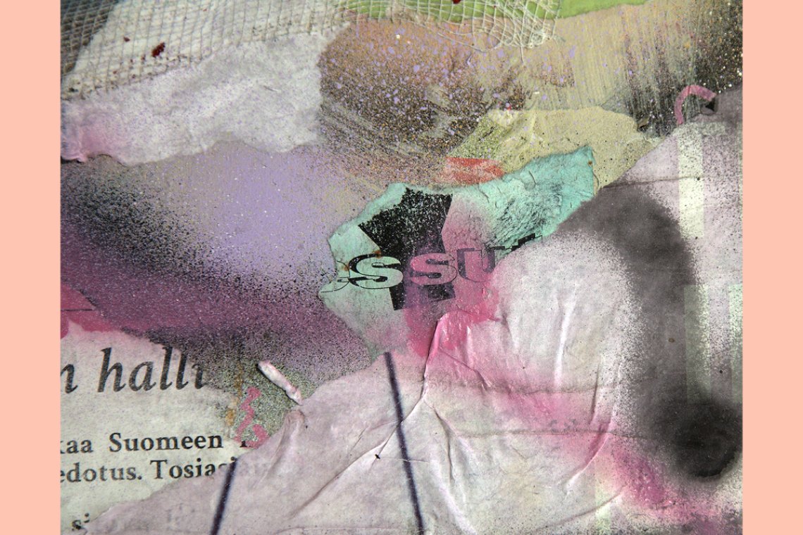 The works in the exhibition are paintings in which, in addition to pens and spray paint, traces left by human remain found in the urban area have been glued and pasted. You can find familiar advertisements or posters, and some messages in the works. Mainly, however, the paintings seek to present the cityscape and people’s ideas as they are.